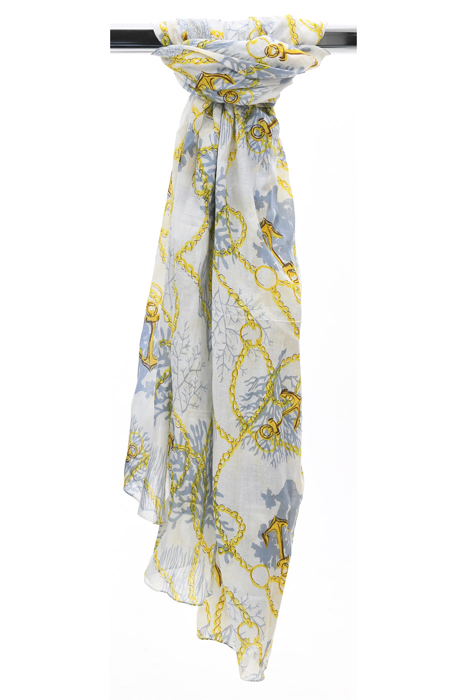 Παρεό παραλίας – φουλάρι με άγκυρες & κοράλια σε χρυσές και γαλάζιες αποχρώσεις.