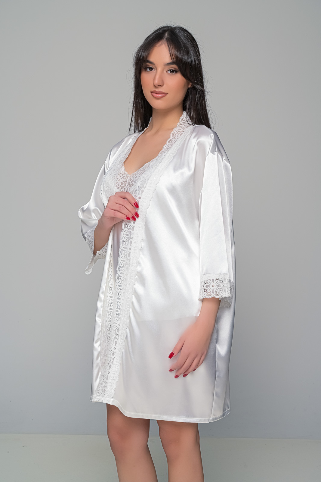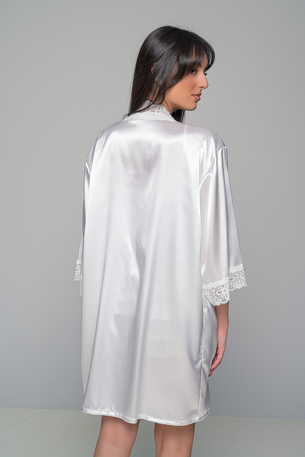 Σατέν ρόμπα από πολυτελές ύφασμα σατέν με ζώνη και φάσες από φλοράλ δαντέλα σε σχέδιο μαργαρίτες.