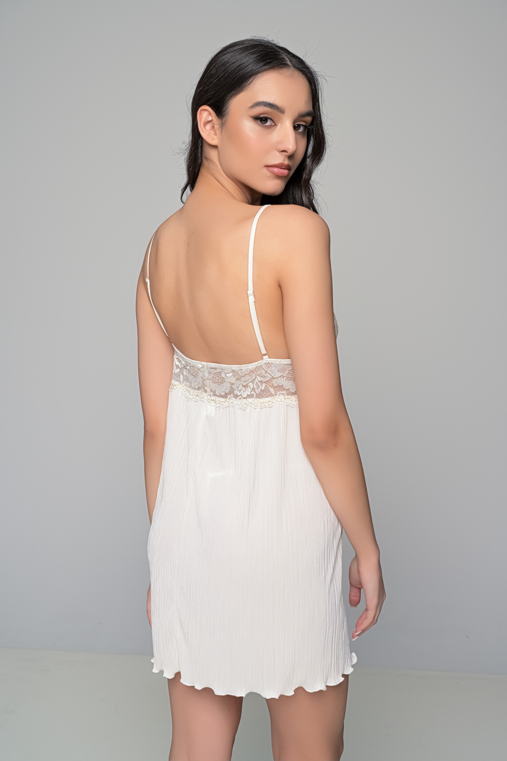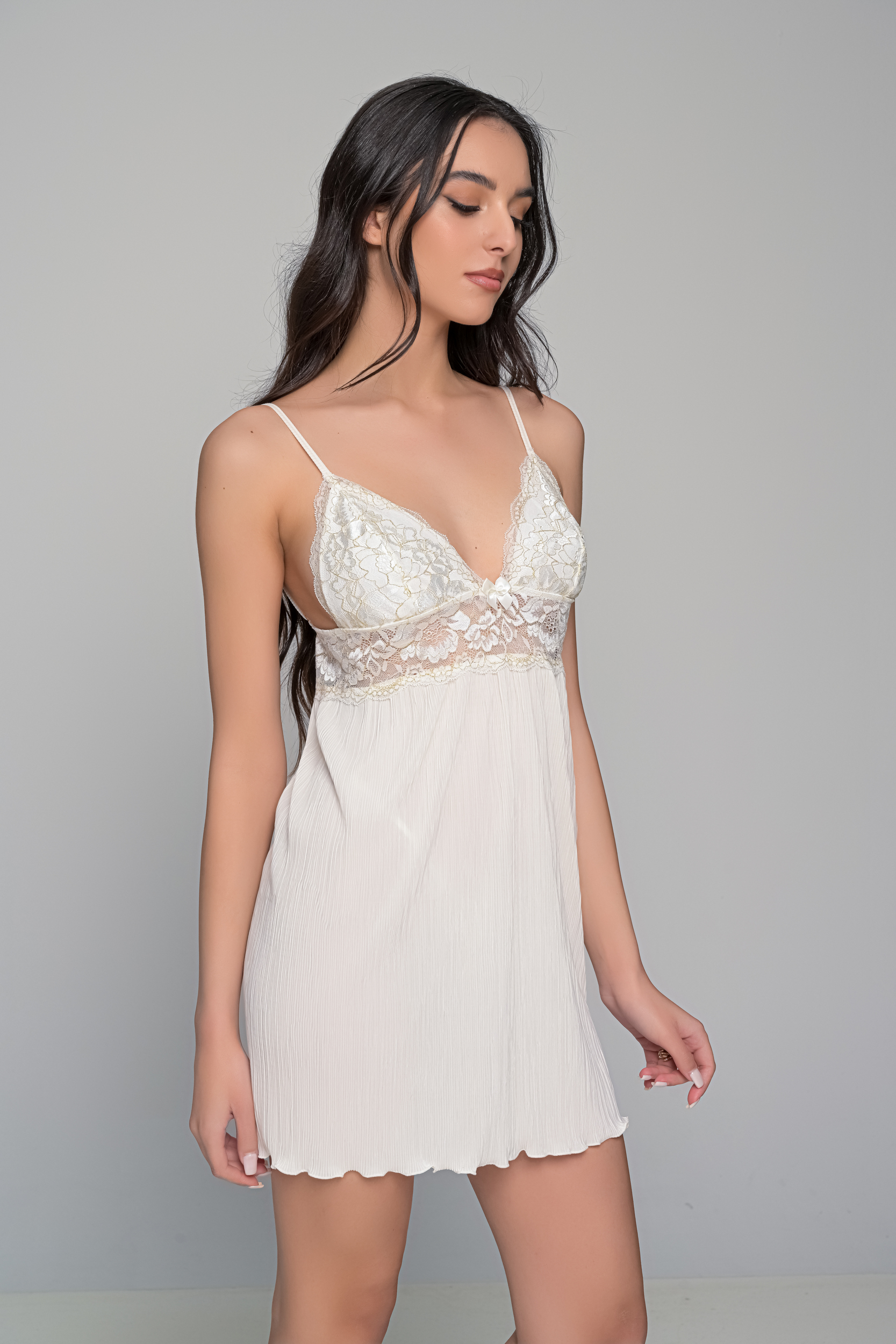 Σετ νυχτικάκι με ασορτί string από ύφασμα πλισέ και δαντέλα που έχει λεπτομέρειες από χρυσοκλωστή.