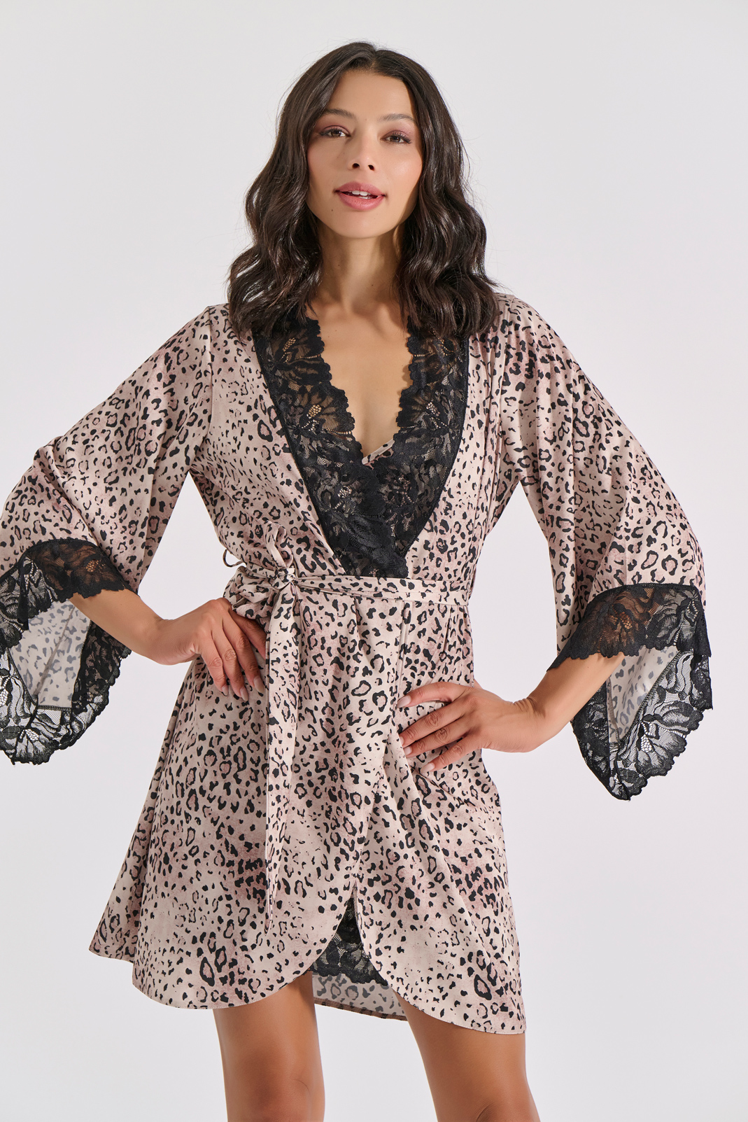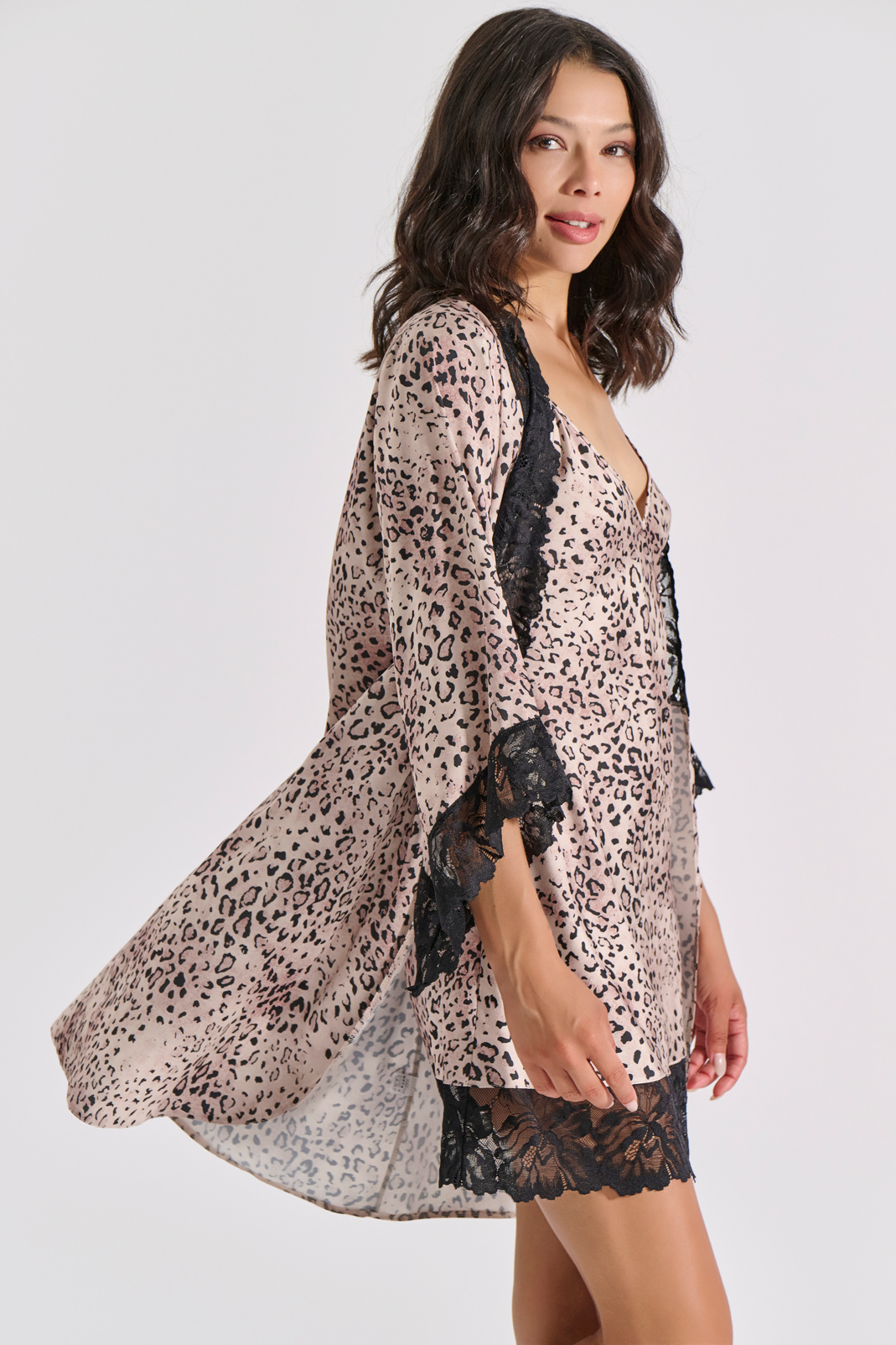Σατέν ρόμπα με αποσπώμενη ζώνη σε σατέν animal print και μαύρη δαντέλα.